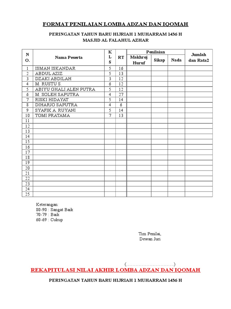 Format Penilaian Lomba Praktik Sholat Xlsx Panitia Maulid Nabi U201cpondok Pesantren Miftahul Waritsin Jl Km Jahuri No 39 Sukosari Sukowono Jember Course Hero from www.coursehero.com · waktu pembuatan 2 (120 menit) jam · peserta harus sudah hadir 10 menit sebelum lomba di mulai Untuk menjamin keobjektifan suatu penilaian diperlukan kriterian tetap yang dijadikan patokan untuk memberi nilai. Unik lomba masak dalam bambu meriahkan art food festival apji. Lomba karya tulis yogyakarta, 15 september 2014 kepada yth. Desain, tingkat artistik, jenis tanaman, hardscape. Form penilaian ini dibuat dalam. Sikap/ada pesert nama peserta hafal tajwid h urut b a (30) (30) (40) (100). Documents similar to kriteria penilaian sayambara sholat jenazah.