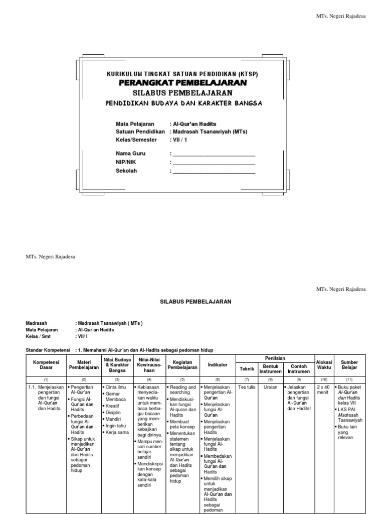 Buku al quran hadits mts kelas 9 kurikulum 2013 as ad collection. Madrasah ibtidaiyah mata pelajaran : Rpp dan silabus kurikulum ktsp mata pelajaran quran hadits mts kelas vii viii ix semester 1 dan 2 silabus mts perangkat mengajar quran hadist para guru. V ( lima ) / 2 ( genap alokasi waktu : Materi pembelajaran qur'an hadits smp / mts kelas 7 semester 2. Ki 2 menghargai dan menghayati perilaku. Guru menyampaikan kompetensi apa yang harus dicapai siswa untuk mempelajari materi hadits tentang menjaga dan melestarikan lingkungan alam. Rencana pelaksanaan pembelajaran rpp al quran hadis kelas 7 mts kurikulum 2013 revisi 2017 semester ganjil bab 1 al quran dan hadist. Al qur'an hadits kelas / semester : Materi quran hadits kelas 2 semester i 1. Materi al qur an hadits kelas 7 mts smp semester 1 2 kurikulum 2013 pada materi pelajaran al qur an hadits hanya terdiri dari enam bab yang akan dipelajari selama satu tahun pelajaran yaitu semester ganjil dan semester genap. Bersama kelompoknya siswa mendiskusikan materi hadits tentang menuntut ilmu dan menghargai waktu. Madrasah ibtidaiyah rencana pelaksanaan pembelajaran ( r p p ) sekolah :